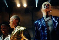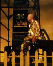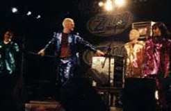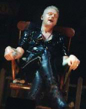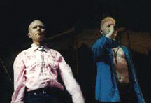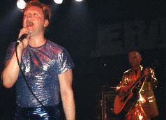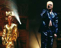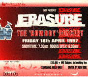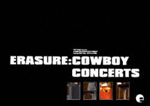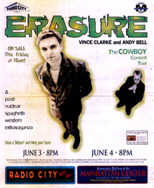 NEW YORK POST'S REVIEW Flamboyant Andy Bell and His partner Vince Clarke are the most unlikely cowpokes to ever punch a cow, but for their Radio City Music Hall engagement, the synth-pop duo created a West Village Wild West show that hitched the band's well-known sense of kitsch theatrics to throbbing dance music. The ghost town on stage was Deadwood Gulch, population six (Bell, Clarke, and four backup singers). The ensemble appeared in matching latex cowboy outfits, looking as if they were ready for a rubber rodeo. There was a Conestoga wagon from which the backup crooners sang, a two-story hotel and saloon, four cacti (that were obscenely proportioned) and an onstage campfire for the boys to get campy by. Even though the set gave the music a theme, much as in an opera, it had the whir and whine of a dance-hall engine rather than the gentle clip-clop of a pony.... ...Bell, a singer with a bold, nearly operatic style, totally embraced the karaoke concept. He worked the crowd with energetic stage antics, including mounting a microphone stand to gallop about the stage, and dancing like a sagebrush hoofer. Bell was totally at ease, giving him rapport with the fans, who never sat during the concert. As hammy as Bell was, his riding partner, Clarke, played the strong, silent type. He spent most of the concert sitting near a 20-foot stack of electronic gadgets (occasionally climbing a scaffold to twiddle a knob at the top of the tower). His stage role was was extremely limited in this erasure production, but he did make his presence felt when he strummed a song on a guitar while dressed in a full-body cactus suit that made him look like Gumby with needles. The show featured much of the music from the band's latest album, "Cowboy", with a few greatest hits mixed in. Because of the music's heavy dance beat, there was an element of of sameness to many of the tunes that made it seem a little monotonous. The crowd of die-hard fans didn't seem to notice --- especially when Erasure covered Abba's "Take A Chance On Me" with excellent results and played their own "In My Arms", which took honors as the fans' favorite tune of the night. -Dan Aquilante |