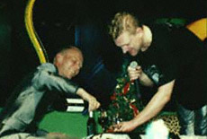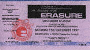USA ----------------------------------- Setlists for Tiny Tour Parts 2 & 3 include: Rain - Stop! - Sometimes - Take A Chance On Me - Victim Of Love - A Little Respect - In My Arms - Always - Star - Fingers & Thumbs - Stay With Me - Spiralling - Heart Of Glass - Sono Luminous - Who Needs Love Like That - Oh L'Amour - Chains Of Love - Chorus - Rock Me Gently - Love To Hate You - Hideaway - Blue Savannah - Ship Of Fools - Don't Say Your Love Is Killing Me Backing singers for the Tiny Tour were: Samantha Smith & Jordan Bailey No Tiny Tour merchandise was sold in the USA, but logo balloons & bottles of soap bubbles were given out free of charge. ----------------------------------- Setlists for the Cowboy tour include: Reach Out - Chains Of Love - World's On Fire - Love To Hate You - Save Me Darling - Always - Sometimes - How Can I Say - A Little Respect - Rock Me Gently - Blue Savannah - Ship Of Fools - Rain - Take A Chance On Me - Boy - Chorus - In My Arms - Oh L'Amour - Love Affair - Don't Say Your Love Is Killing Me - Stop- You Surround Me Backing singers for the Cowboy tour were: Samantha Smith, Jordan Bailey, Xavier Barnett, and John Gibbons Merchandise sold on the Cowboy tour included: program books, tee shirts, metal e-logo pins & necklaces, posters, baseball caps, coffee mugs, condoms. Special Christmas logo black tee shirts and Christmas cards were available at the December fan club gig only. Andy Bell is wearing the shirt in the photo at left. The card has the same design. Support acts for the Cowboy tour included: Heaven 17 (UK gigs), and comic Ennio Marchetto (Germany & some USA gigs). Erasure appeared with David Bowie in Mexico (Oct 23) and Brazil (Nov 2), Other bands appearing with Erasure